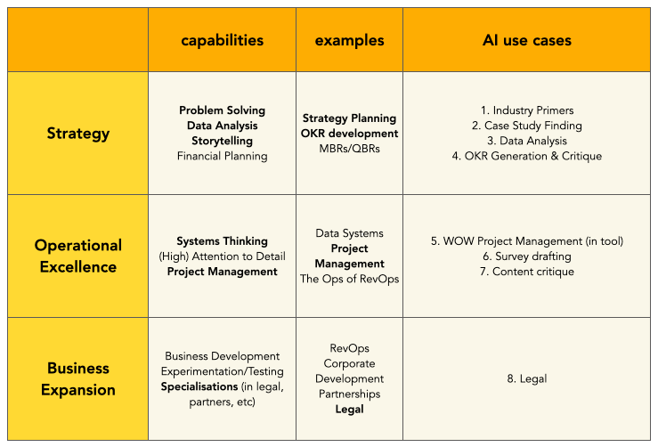 From COOs, to one (wo)men band BizOps teams, it seems that everyone has been experimenting with AI to make organisations more efficient, more scalable, or just plain faster. I recently spoke to 20 Strategy & Ops pros, in companies in the UK and the US, ranging from 50 people to 800, with varied revenues, and both SaaS and marketplaces, to delve into how are they using AI in their day-to-day.