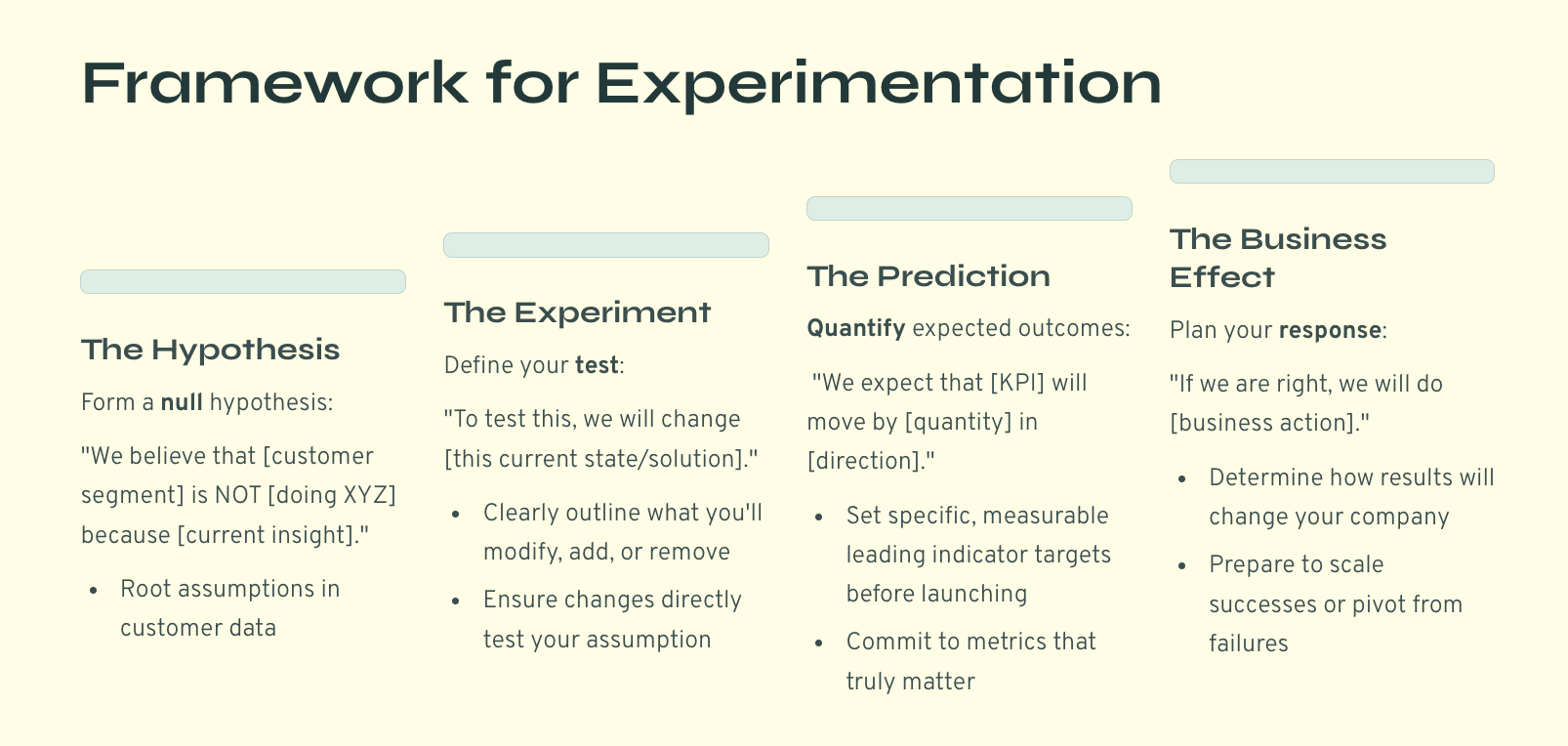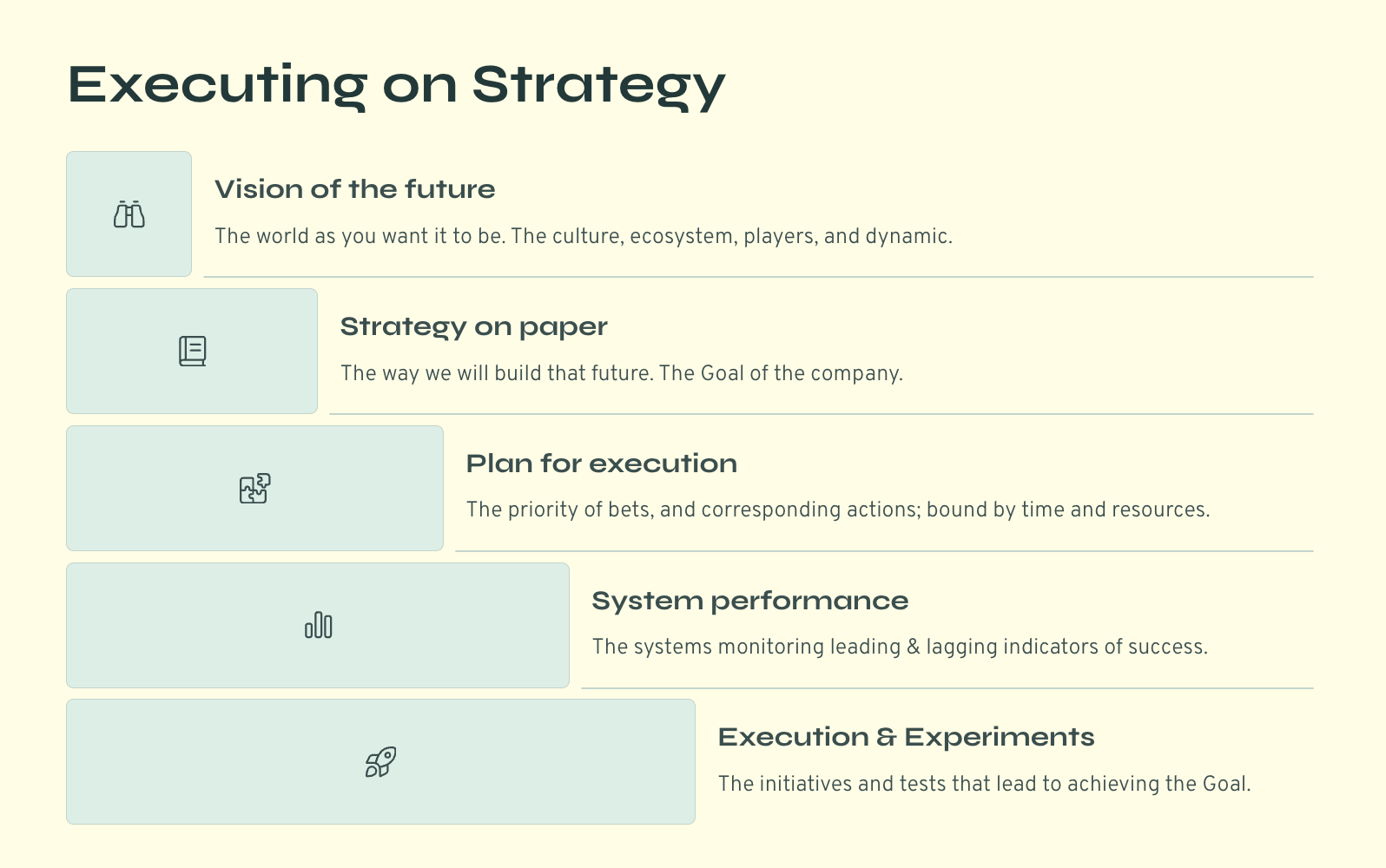 Letâs imagine you got your Vision of the world, and your Strategy (on paper at least). You have a meticulous Plan for execution with prioritised bets. Your BizOps team has the capability to set, monitor, and report insight on the systemâs performance (I am calling the company a system, because thatâs what it is: a system for generating revenue). But no Strategy and Plan go as planned. It is no secret. So you have to be prepared to go a level deeper and get early signal about what works. The next level is the day to day Execution: the cadence, framework, and learning from Experiments, which will drive your top line decision-making.