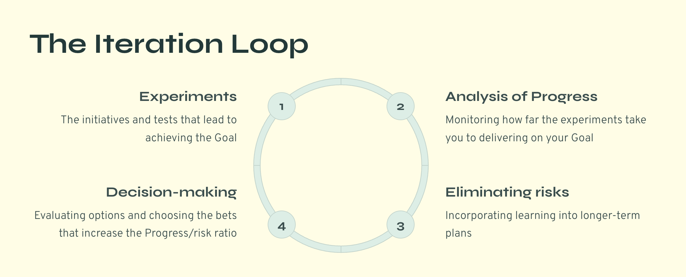 If you want to keep increasing your P/r ratio, you have to keep iterating. Above is my Iteration Loop diagram. Nothing ground-breaking. But it shows how experiments help push your Progress forward (in 2), and keep eliminating risks, or unknowns (in 3). It is up to you of course to have set the experiments in ways that you can do 2, 3, and ultimately improve your decision-making.
